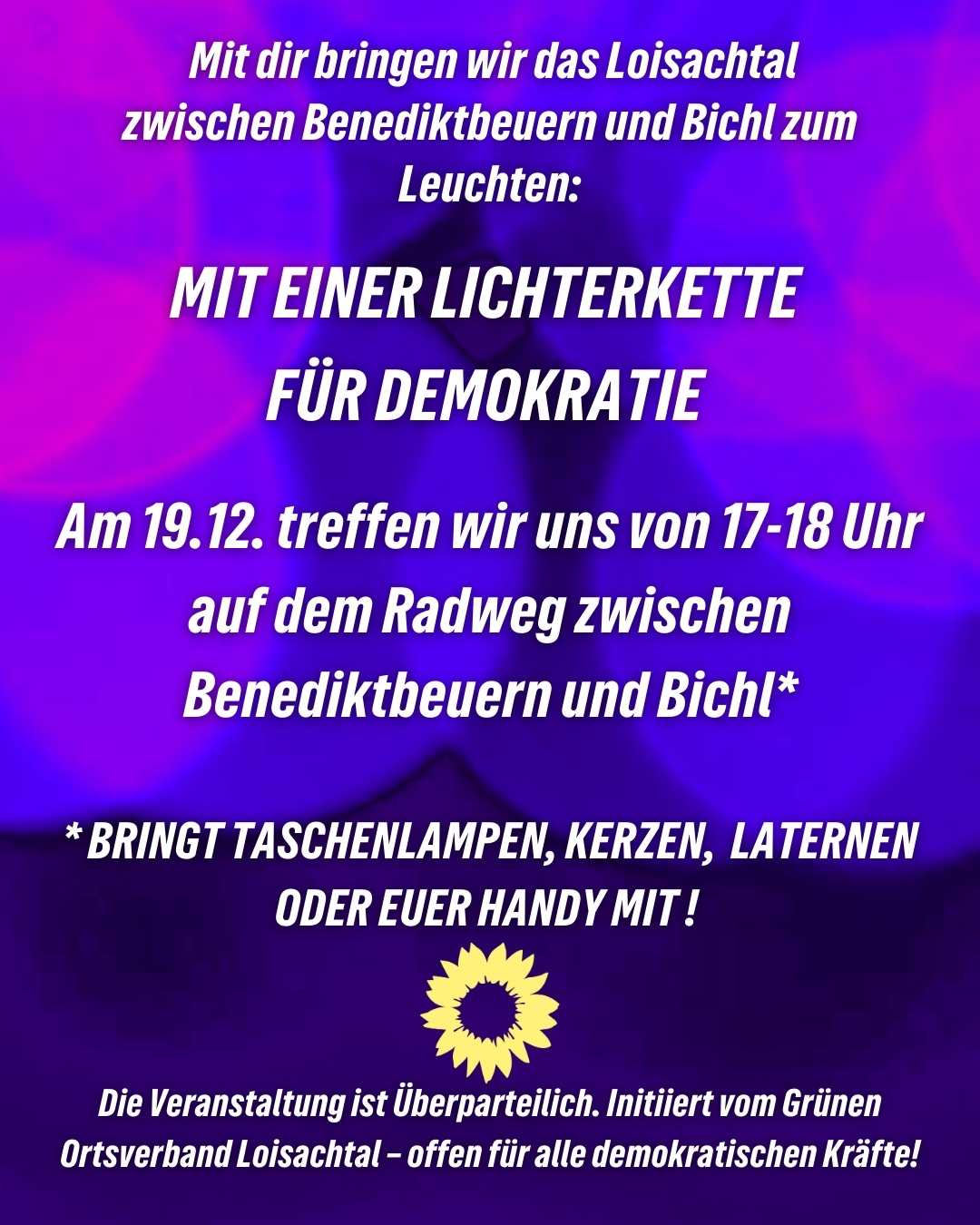 Auf dem Radweg zwischen Benediktbeuern und Bichl bilden wir eine Lichterkette – überparteilich, friedlich und vereint. Bringt Taschenlampen, Stirnlampen, Laternen oder euer Handy mit und werdet Teil dieser besonderen Aktion.