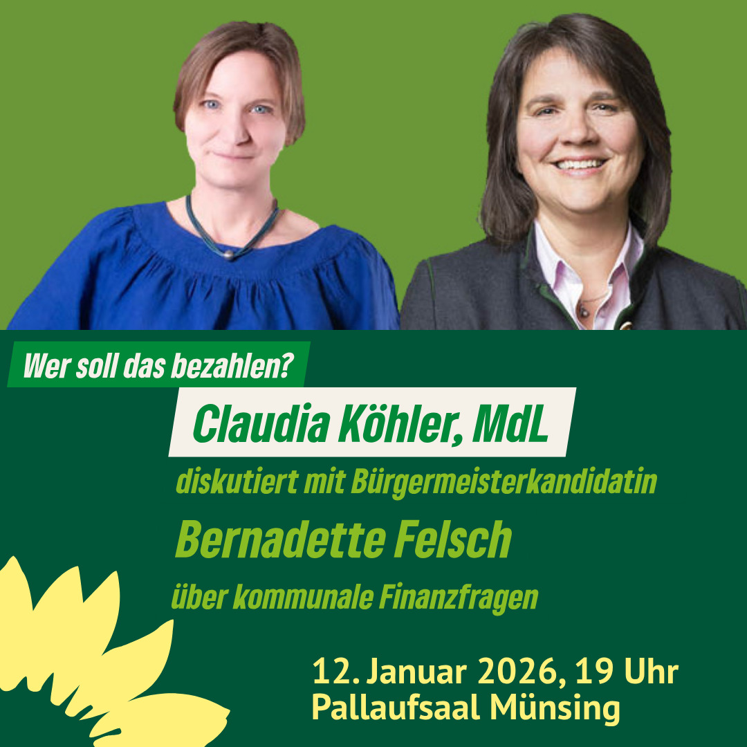 Bürgermeisterkandidatin Bernadette Felsch spricht mit Expertin Claudia Köhler, MdL und stellv. Vorsitzende im Ausschuss für Staatshaushalt und Finanzfragen über kommunale Finanzen am 12. Januar 2026 um 19 Uhr im Pallaufsaal, Münsing.