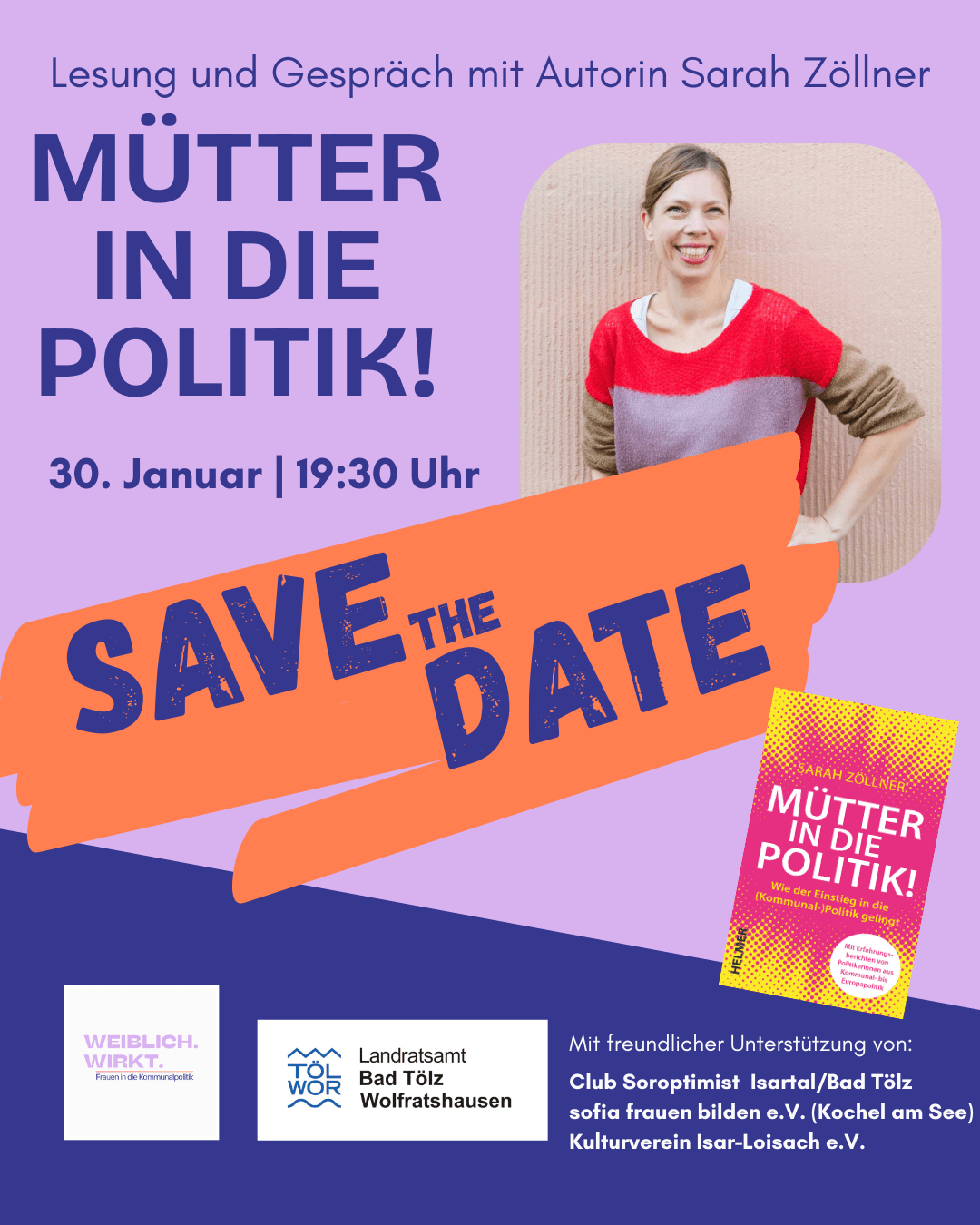Die Initiative weiblich.wirkt. veranstaltet gemeinsam mit der Gleichstellungsstelle des Landratsamts Bad Tölz-Wolfratshausen eine Lesung mit der Journalistin und Autorin Sarah Zöllner. Sie liest aus ihrem 2025 erschienenen Buch „Mütter in die Politik!“ (Helmer-Verlag).