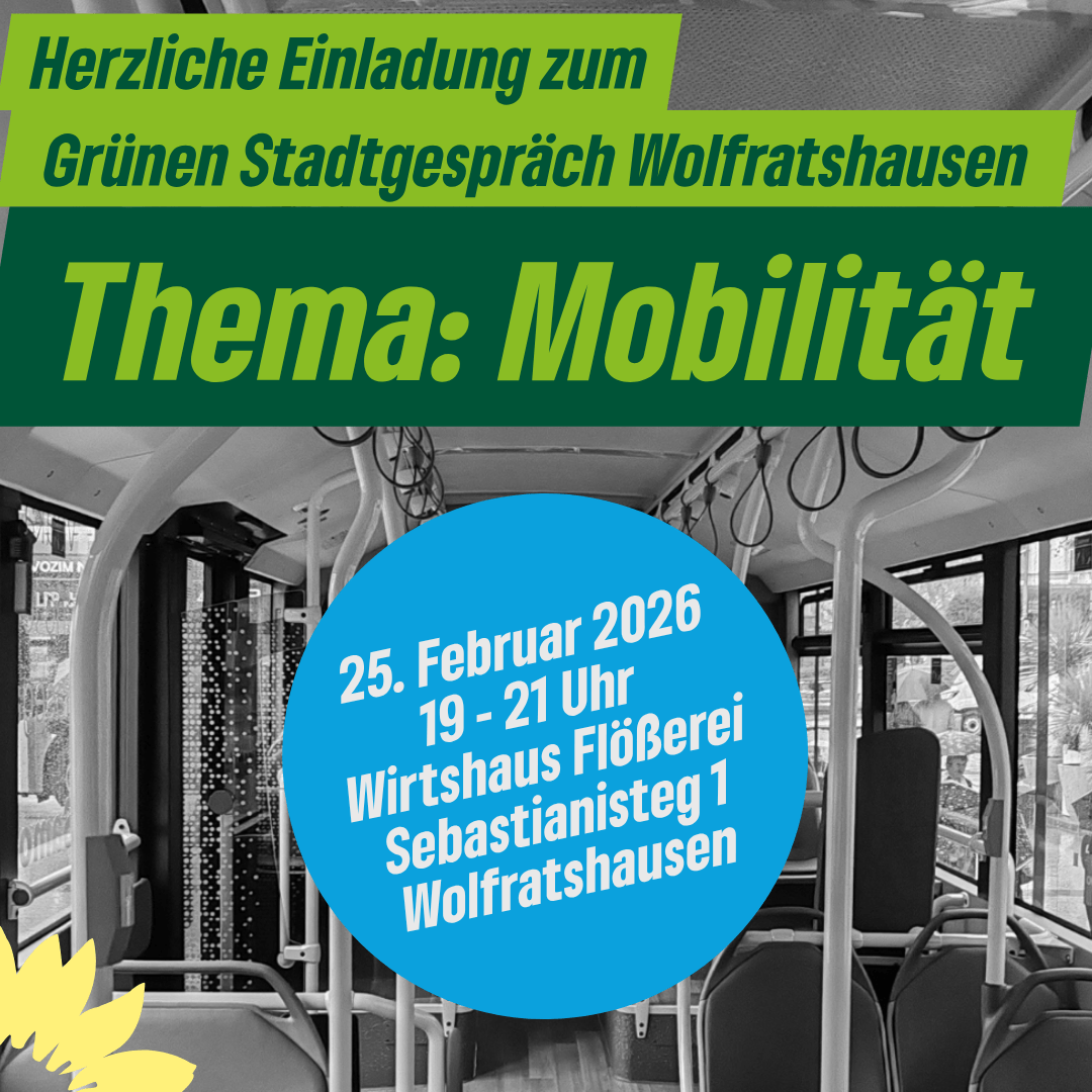 Wie kommen wir in Wolfratshausen von A nach B? Ob Bus, Bahn, Rad oder Auto – Mobilität betrifft uns alle. Beim Grünen Stadtgespräch möchten wir mit euch über die Zukunft der Mobilität in unserer Stadt diskutieren.