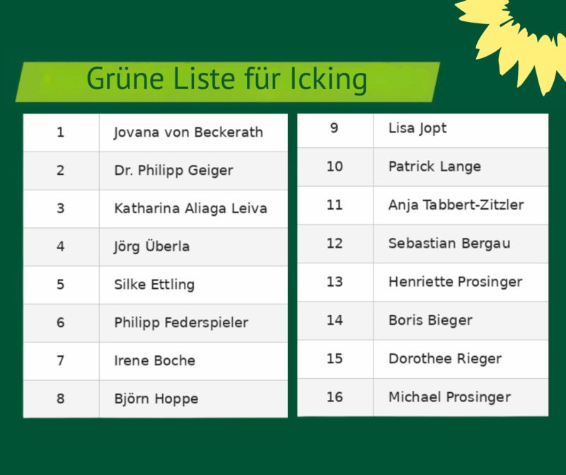 Wir freuen uns, euch unsere Kandidat*innen für den Gemeinderat vorzustellen. Mit Tatendrang und Begeisterung möchten wir Icking gemeinsam zu einem noch lebenswerteren Ort für alle Generationen machen – nachhaltig, sozial und zukunftsorientiert.