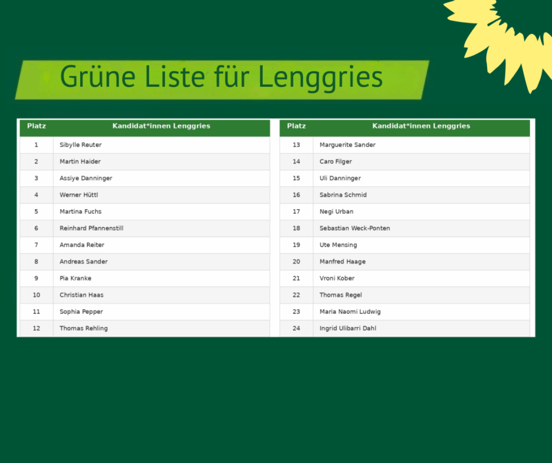 Hiermit stellen wir euch unsere Kandidat*innen für den Gemeinderat vor. Gemeinsam möchten wir Lenggries zu einem noch lebenswerteren Ort für alle Generationen machen – nachhaltig, sozial und zukunftsorientiert.