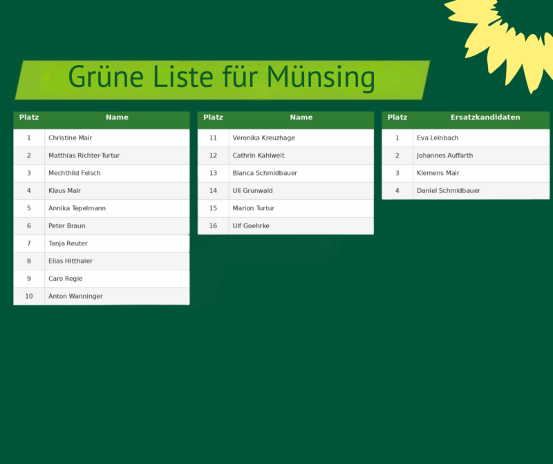 Mit Freude und großem Engagement stellen wir euch unsere Kandidat*innen für den Gemeinderat vor. Gemeinsam möchten wir Münsing zu einem noch lebenswerteren Ort für alle Generationen machen – nachhaltig, sozial und zukunftsorientiert.