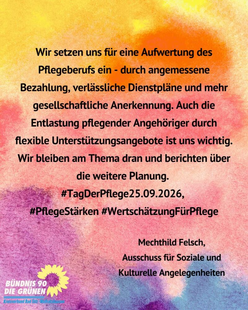 Für uns Grüne steht fest: Der Tag der Pflege muss die unverzichtbare Arbeit der professionell und privat Pflegenden würdigen. Gleichzeitig brauchen wir strukturelle Verbesserungen für mehr Personal, bessere Arbeitsbedingungen und eine solidarische Finanzierung der Pflege.